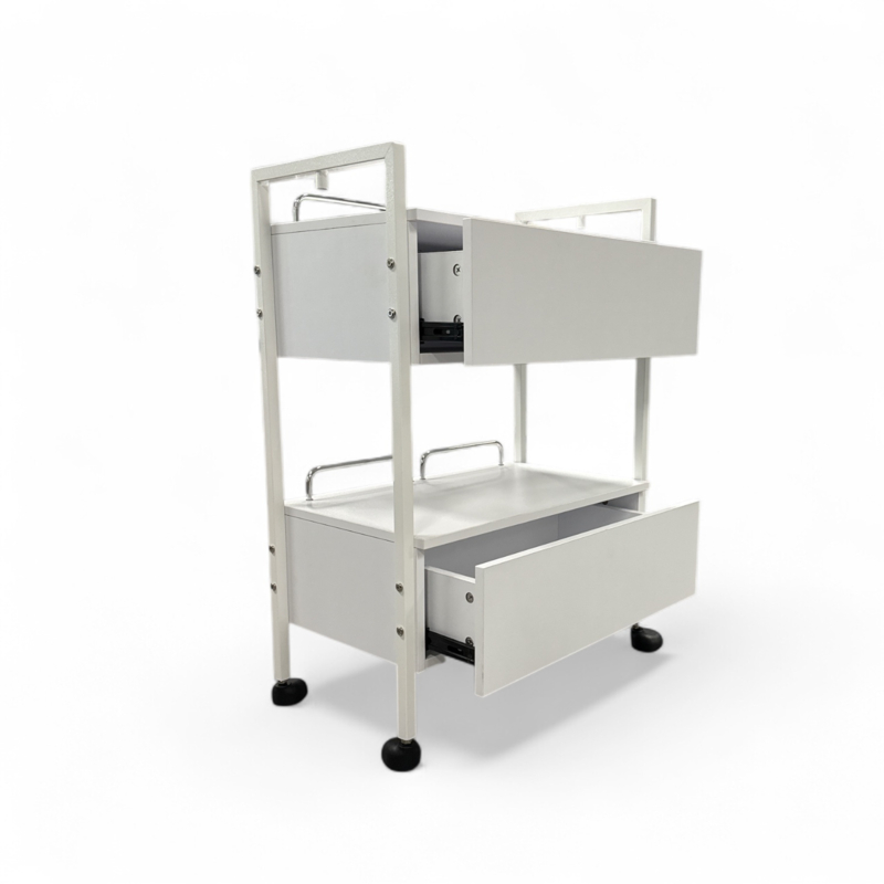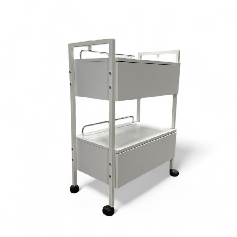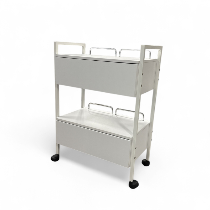 Dit compacte, witte salonmeubel heeft 2 ruime laden en een handig open werkvlak, zodat u uw toestel, producten en instrumenten netjes kunt opbergen én toch alles dichtbij houdt tijdens de behandeling.
